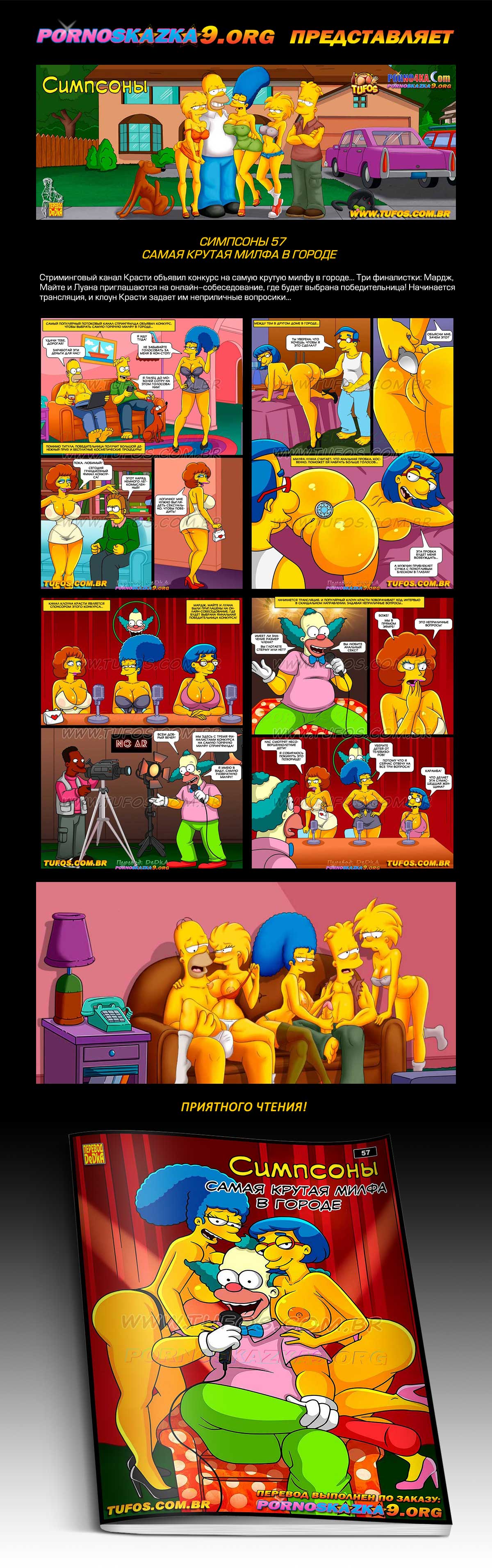 Порно комикс «Симпсоны. Часть 57. Самая крутая милфа в городе.» Стриминговый канал Красти объявил конкурс на самую крутую милфу в городе… Три финалистки: Мардж, Майте и Луана приглашаются на онлайн-собеседование, где будет выбрана победительница! Начинается трансляция, и клоун Красти задает им неприличные вопросики…